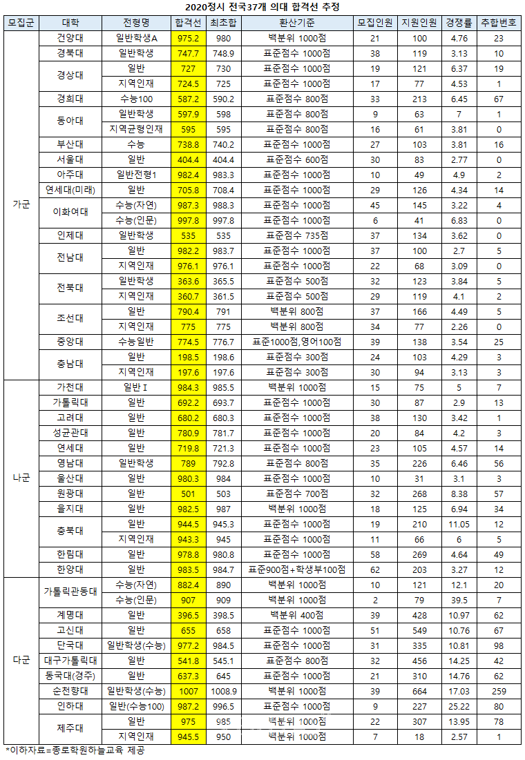 종로하늘의 분석에 의하면 2020정시에서 서울 소재 의대 합격선은 상위누적 0.3% 이내로 추정된다. 지방 의대의 합격선도 상위누적 1.7% 이내로 매우 높은 수준이다. 과탐을 선택한 자연계열 학생이 기준이다. 수험생들은 대학마다 점수 산출방식과 반영비율이 다른점을 유의해야 한다. 실제 동일한 환산기준이라 해도 대학간 비교는 어려운 셈이다. 다만 추합인원 추정치와 최초합격선과 최종합격선의 격차를 세부적으로 분석하는 것은 가능하다. 본인의 성적을 기준으로 조금 더 합격가능성이 높은 대학을 찾아 볼 수 있는 셈이다.