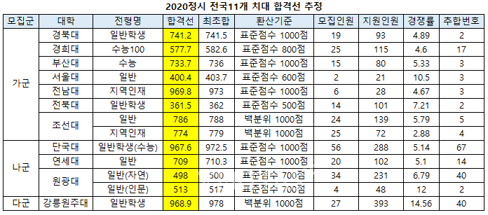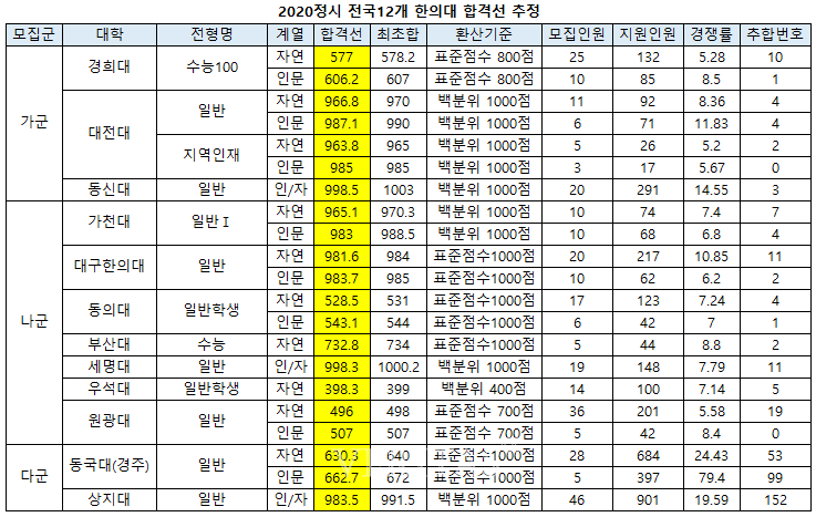 가군 모집을 진행한 대전대와 동신대의 경우 백분의 1000점이 환산 기준이다. 합격선 추정치는 대전대 일반(자연) 966.8점(970점), 대전대 일반(인문) 987.1점(990점), 대전대 지역인재(자연) 963.8점(965점), 대전대 지역인재(인문) 985점(985점), 동신대 일반 998.5점(1003점)으로 추정된다.