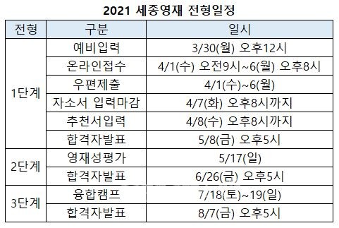 [베리타스알파=강태연 기자] 세종과학예술영재학교(이하 세종영재)가 2021학년 신입생 정원내 84명, 정원외 6명 이내를 선발한다. 모집인원은 지난해와 동일하다. 지난해부터 정원외 모집인원인 지역우수자전형이 10명에서 2명으로 크게 줄었다. 2020학년부터 신설된 외국인 전형도 선발인원이 동일하다. 올해의 경우 1단계 전형 우선선발이 폐지됐고, 명확하지 않았던 1단계 선발인원을 1000명 내외로 밝혔다. 대신 일반전형 2단계 통과자들 가운데 세종 소재 학생들을 8명 이내로 우선선발하는 전형은 그대로 유지된다.