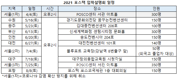 올해 설명회는 전국 지역을 순회하며 총 9회 진행할 예정이다. 지역별로 ▲수원 5월16일 경기도문화의전당 꿈꾸는컨벤션센터(150명) ▲광주 5월23일 김대중컨벤션센터 206호(100명) ▲부산 6월13일 신세계백화점 센텀시티점 문화홀(300명) ▲인천 6월20일 송도컨벤시아 204호(150명) ▲대전 6월27일 대전컨벤션센터 101호(140명) ▲서울2차 7월4일 블루포트 교육장(외국고 졸업자 대상, 50명) ▲대구 7월18일 대구창의융합교육원 시청각실(150명) ▲서울3차 7월25일 포스코센터 서관 아트홀(350명) ▲포항 8월8일 포스텍 포스코국제관 1층 대회의실(150명) 순이다. 모두 오후2시부터 설명회가 시작된다. 내달 4일 계획됐던 서울1차 설명회는 코로나19 감염에 대한 우려로 취소됐다.