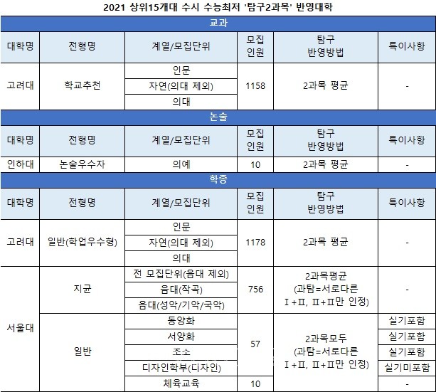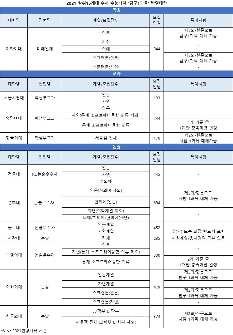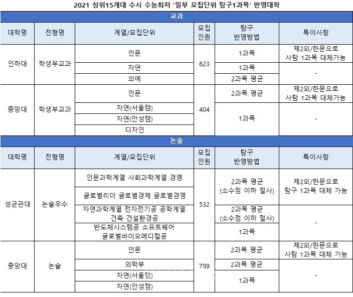 상위15개대학 중 탐구1과목만을 수능최저에 적용하는 전형은 교과에서 서울시립대 숙명여대 한국외대, 논술에서 건국대 경희대 동국대 서강대 숙명여대 이화여대 한국외대, 학종에서 이화여대다. 일부 모집단위에서만 1과목을 반영하는 경우도 있다. 인하대는 학생부교과에서 의예를 제외한 나머지 모집단위에서 1과목을 반영한다. 중앙대 학생부교과는 인문을 제외한 나머지 모집단위에 한해 1과목을 반영한다. 성균관대 논술우수는 반도체시스템공 소프트웨어 글로벌바이오메디컬공, 중앙대 논술은 자연계열에서 1과목만 반영한다.
