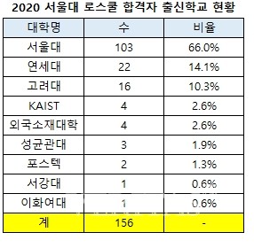 KAIST 4명(2.6%), 성균관대 3명(1.9%), 포스텍 2명(1.3%), 서강대 이화여대 각1명(0.6%) 순이었다. 외국소재대학 출신은 4명(2.6%)이었다. 지난해와 비교하면 서울대 출신 합격자 수가 6명 증가한 반면 연세대 고려대 출신은 각 1명, 4명 감소했다.