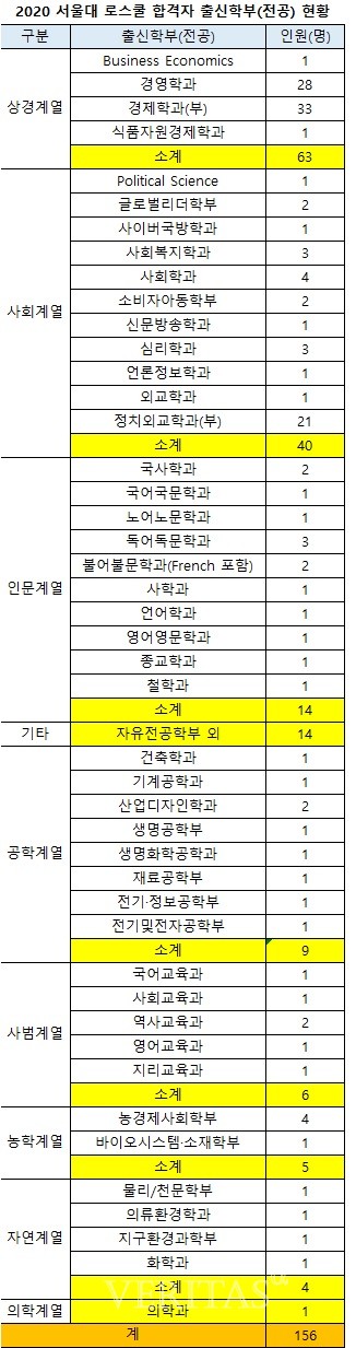 상경/사회계열이 60% 이상을 차지한 가운데 인문계열 14명(9%), 기타(자유전공학부 외) 14명(9%), 공학계열 9명(5.8%), 사범계열 6명(3.8%), 농학계열 5명(3.2%), 자연계열 4명(2.6%), 의학계열 1명(0.6%) 순이었다.