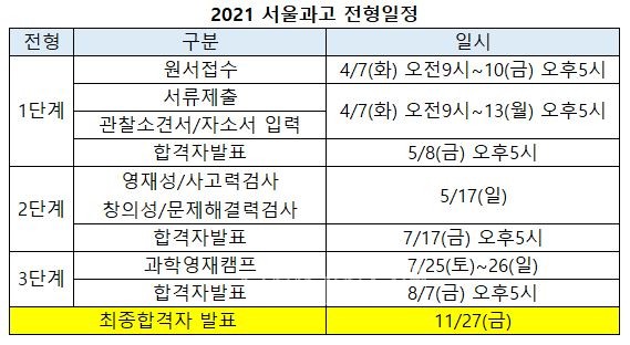 올해 가장 큰 변화로는 서울과고가 앞서 예고했던 것처럼 서울 25개 자치구와 서울외 16개 시도 등 41개 지역에서 선발하는 '지역인재 우선선발 인원'을 기존 1명에서 2명 이내로 확대됐다. 2단계 합격자 인원도 기존 정원 2배수 내외(240명 내외)에서 200명 내외로 변경됐다. 서류제출에서도 중1,2학년과 중3학년 학생은 서로 다른 양식의 관찰소견서A를 제출해야 하며, 올해부터는 이공계열에 진학을 하겠다는 '이공계열 진학 확약서'를 작성해 제출해야 한다. 게다가 지난해 12월 예정했던 것처럼 의학계열 대학 지원 시 교육비/장학금을 환수하고 교내대회 시상을 제외한다는 내용이 추가됐다. 수학과학 등 특정영역에서 탁월한 재능이 있다고 인정되는 학생을 2단계 전형에서 우선선발하는 특정영역 인재는 그대로 유지된다. 내달 7일부터 10일 오후 5시까지 원서접수를 진행한 후 단계별 전형을 거쳐 8월7일 합격예정자를 발표하고 11월27일 최종합격자를 발표하는 일정이다. 서울과고는 6일 전형요강 공개와 함께 코로나19 확산 영향으로 2021학년 신입생 입학설명회를 실시하지 않는다고 밝혔다.