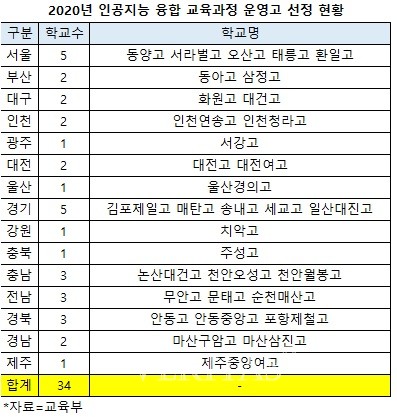 [베리타스알파=권수진 기자] 올해 인공지능 융합 교육과정 운영고에 포항제철고 등 전국 34개교가 선정됐다. 이들 학교는 2021학년 신입생부터 2023년까지 전체 교과 수업의 15% 내외를 정보 정보과학 인공지능 등 다양한 과목으로 편성/운영한다. 공동 교육과정으로 연간 4단위 이상의 과목을 개설해 인근 학교 학생들도 이수할 수 있도록 운영한다.