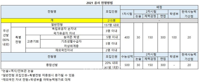 일반전형의 전형배점은 1차시험40%(400점)+논술3%(30점)+체력검정15%(150점)+면접30%(300점)+학생부10%(100점)+한국사능력검정시험2%(20점)다. 특별전형에 해당하는 독립유공자 손자녀/국가유공자 자녀, 고른기회-농어촌학생, 고른기회-기초생활수급자/차상위계층도 동일한 방법으로 실시한다. 지난해의 경우 일반전형과 특별전형의 전형배점은 1차시험11.5%(30점)+논술3.8%(10점)+체력검정11.5%(30점)+면접30.8%(80점)+학생부38.5%(100점)+한국사능력검정시험 가산점3.8%(10점)이었다. 올해 1차시험과 체력검정의 배점이 올라간 특징이다.