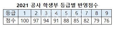 학생부는 국어 영어 수학을 공통으로 반영하며 이에 더해 인문계열은 사회, 자연계열은 과학을 반영해 산출한다. 재학생은 3학년 1학기까지, 졸업생은 3학년 2학기까지 전 이수과목을 평가한다. 등급별 점수에 변화가 있다. 1등급 100점, 2등급 97점, 3등급 94점, 4등급 91점, 5등급 88점, 6등급 85점, 7등급 82점, 8등급 79점, 9등급 76점이다. 지난해의 경우 1등급 100점 2등급 98점, 3등급 96점, 4등급 94점, 5등급 92점, 6등급 90점, 7등급 88점, 8등급 86점, 9등급 84점이었다.