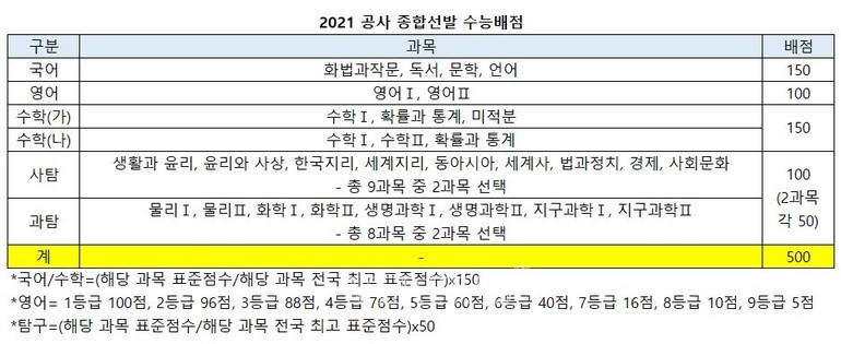 탐구영역 배점의 경우 국어(화법과작문/독서/문학/언어) 150점, 영어(Ⅰ/Ⅱ) 100점, 수학 가형(수학Ⅰ/확률과통계/미적분) 나형(수학Ⅰ/수학Ⅱ/확률과통계) 각 150점이다. 사탐의 경우 9개과목 중 2과목, 과탐은 8과목 중 2과목을 선택해 2개 과목 각 50점을 부여해 총 100점이다.