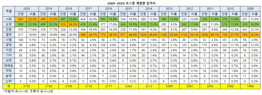 [베리타스알파=권수진 기자] 로스쿨 입시에서 가장 두각을 드러낸 전공은 지난해에 이어 올해도 사회계열인 것으로 나타났다. 2009년 로스쿨이 도입된 이후 2017학년까지 9년간 법학계열이 1위를 유지하다, 2018학년 상경계열이 첫 1위로 올라섰지만 2019학년 사회계열에 1위를 내준 이후 유지한 모습이다.