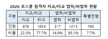 2020 로스쿨 전체 합격자는 전년에 비해 6명 줄어든 2130명이다. 이 중 자교출신은 276명(22.3%), 타교출신은 1654명(77.7%)이다. 법학사 출신은 317명(14.9%)으로 지난해와 비교해 3.6%p 감소했다. 비법학사는 1813명(85.1%) 선발됐다.