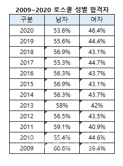합격자를 성별로 구분해보면 남성이 1142명(53.6%), 여성이 988명(46.4%) 합격했다. 비중으로 따졌을 때 지난해에 비해 남자의 비중이 다소 줄고 여자의 비중이 확대됐다. 지난해는 남자가 55.6%, 여자가 44.4%였다.