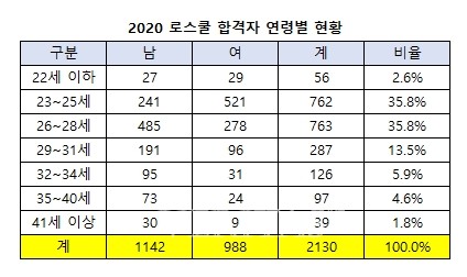 연령별로는 26~28세가 763명(35.8%)으로 가장 많았다. 23~25세가 762명(35.8%), 29~31세가 287명(13.5%) 순으로 10%를 넘는 비중이었다. 32~34세 126명(5.9%), 35~40세 97명(4.6%) 순으로 뒤를 이었다. 22세 이하도 56명(2.6%), 41세 이상도 39명(1.8%)이었다.