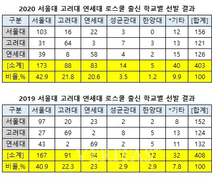 전년의 경우 SKY출신이 352명으로 전체의 86.3%를 차지한 것과 비교하면 소폭 줄었다. 서울대 출신은 6명 증가한 반면, 고려대와 연세대는 각 3명, 11명 감소했다.