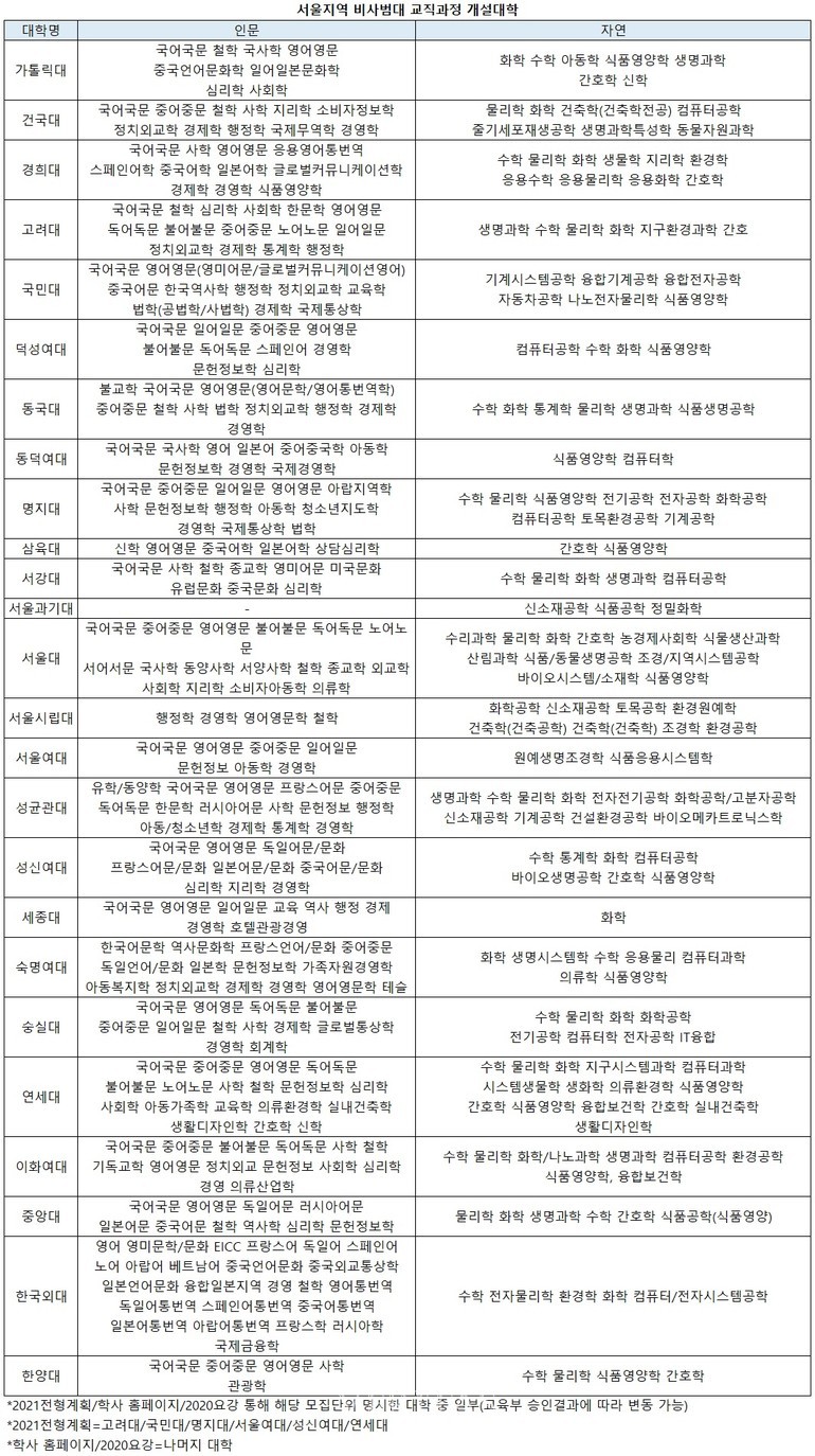 2021수시요강이 아직 공개되지 않았지만, 2021전형계획을 통해 교직이수 학과를 공개한 곳은 고려대 국민대 명지대 서울여대 성신여대 연세대다. 경희대의 경우 전형계획에 교직이수 가능여부 학과는 추후 입학처 홈페이지에서 최종 확인할 수 있다고 밝혔다. 교직과정 선발과 관련해서는 추후 수시요강과 홈페이지 공지 등을 통해 확인해야 한다.