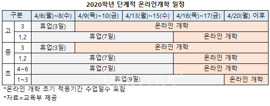 학교급별 학년별로 개학시점을 다소 차이가 있다. 가장 이른 4월9일부터 고3과 중3이 온라인으로 개학할 예정이며, 일주일 후인 4월16일에는 고1,2 중1,2 초4~6이 신학기를 시작한다. 마지막으로 4월20일엔 초1~3의 온라인 개학이 실시된다. 온라인 개학의 초기 적응기간은 수업일수에 포함하고, 온라인 개학 기간에 학생들의 등교는 중지된다. 교육부는 향후 지역별 감염증의 진행 상황과 학교의 여건을 고려해 원격수업과 출석수업의 병행 등 탄력적인 학사 운영 방안을 검토할 계획이다.