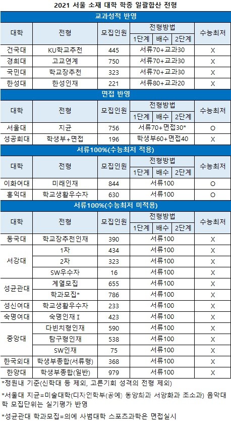 [베리타스알파=권수진 기자] 올해 서울소재 대학 중 학종 일괄합산 전형을 실시하는 곳은 어디일까. 일괄합산 전형은 단계별 전형을 거치지 않고 모든 전형요소를 한번에 합산해 합격자를 가리는 전형을 의미한다. 1단계 합격여부를 기다렸다가 2단계 전형을 실시하는 것보다 대체로 전형이 간단하다. 모든 일괄합산 전형이 그런 것은 아니지만, 면접을 실시하지 않는 경우도 많아 이미 준비돼있는 학생부, 서류만으로 지원이 가능하다는 특징도 있다.