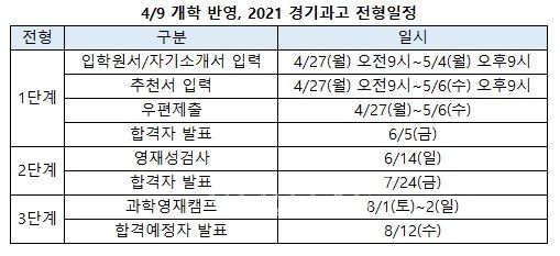 [베리타스알파=강태연 기자] 과학영재학교 경기과고가 9일부터 학교급/학년별로 시차를 두고 실시되는 개학 일정에 맞게 변경된 전형일정을 공개했다. 앞서 6일로 개학이 연기됐을 당시 전반적인 일정이 미뤄졌지만, 추가적인 개학연기로 전형일정도 추가 연기됐다. 경기과고는 1단계 전형과 2단계 영재성검사 일정에만 변화가 있다. 변경된 원서접수 기간은 27일부터 내달 4일까지다. 2단계 전형 일정은 8개교 모두 6월14일로 통일될 것으로 보인다.