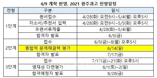 [베리타스알파=강태연 기자] 과학영재학교 광주과고가 9일 이후로 변경된 개학 일정에 맞게 변경된 전형일정을 공개했다. 6일로 개학이 연기됐을 당시 전반적인 일정이 미뤄졌지만, 개학연기로 전형일정도 다시 연기됐다. 광주과고는 전반적인 일정 모두 변경된 특징이다. 원서접수는 28일부터 내달 4일까지다. 2단계 전형일정은 변화된 일정이 공개된 다른 영재학교와 동일하게 6월14일이다.