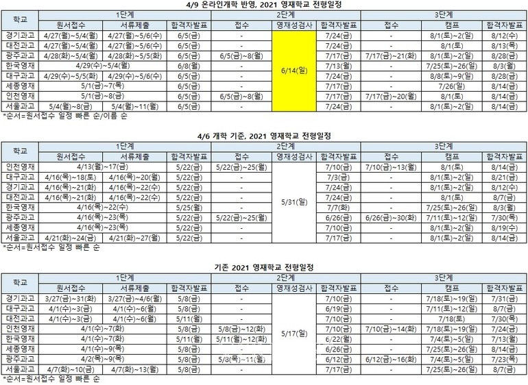 변경된 일정 중 가장 먼저 원서접수를 실시하는 곳은 경기과고와 대전과고다. 두 학교 모두 27일부터 내달 4일까지의 일정이다. 이어 광주과고 28일부터 내달 4일, 한국영재 29일부터 내달 4일, 대구과고 29일부터 내달 5일, 세종영재 내달 1일부터 7일, 인천영재 내달 1일부터 8일, 서울과고는 내달 4일부터 8일까지다. 일정이 조정되면서 3단계 이후 일정에 변화가 있는 곳은 광주과고와 대구과고 대전과고 세종영재 4개교다. 광주과고와 대구과고는 전반적인 일정 전체가 변경됐고, 대전과고는 3단계 합격자 발표 일정이 미뤄졌다. 특히 세종영재의 경우 3단계 전형을 기존 1박2일에서 1일 캠프로 축소했다. 나머지 4개교는 2단계 전형일의 변화 이후 일정에는 변화가 없었다.