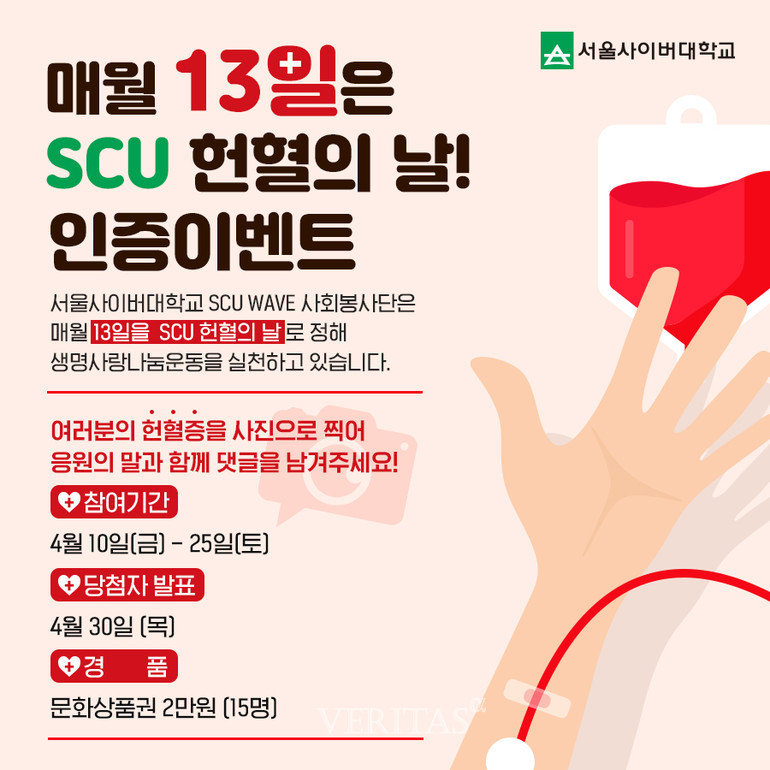 이번 인증 이벤트 참여는 헌혈 이후 헌혈증을 사진으로 촬영, 서울사이버대 공식 블로그 댓글에 응원의 말과 함께 남기면 된다. 참여기간은 이달 10일부터 25일까지 진행되며, 당첨자는 이달 30일 발표 후 서울사이버대 총학생회에서 준비한 경품이 지급된다.