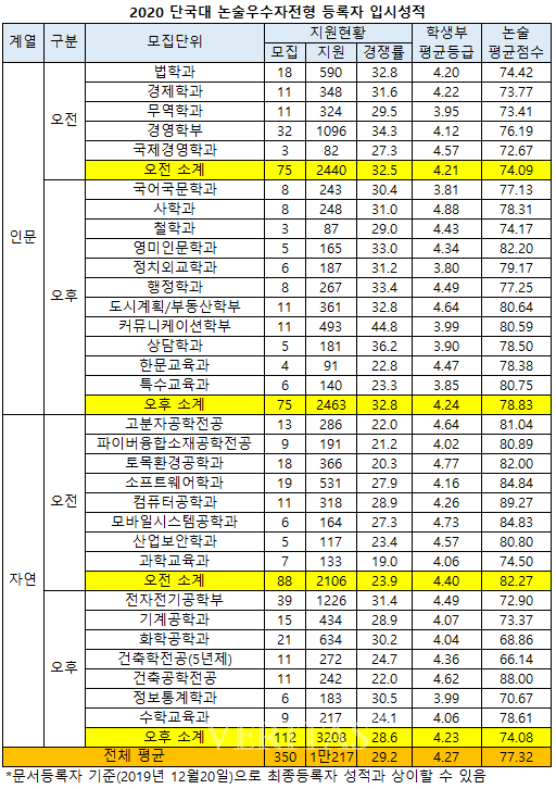 지난해 단대 논술은 350명 모집에 1만217명이 지원하며 29.2대1의 경쟁률을 보였다. 등록자들의 전반적인 학생부 평균등급은 4등급대였다. 전 모집단위 논술성적의 평균점수는 77.32점이었다. 컴퓨터공학과의 평균점수가 89.27점으로 가장 높았으며, 건축학전공이 66.14점으로 최저를 기록했다. 다만 단대가 공개한 내용은 지난해 12월20일 문서등록자 기준으로 집계한 통계다. 최종등록자들의 성적과는 다소 차이가 있을 수 있는 셈이다.