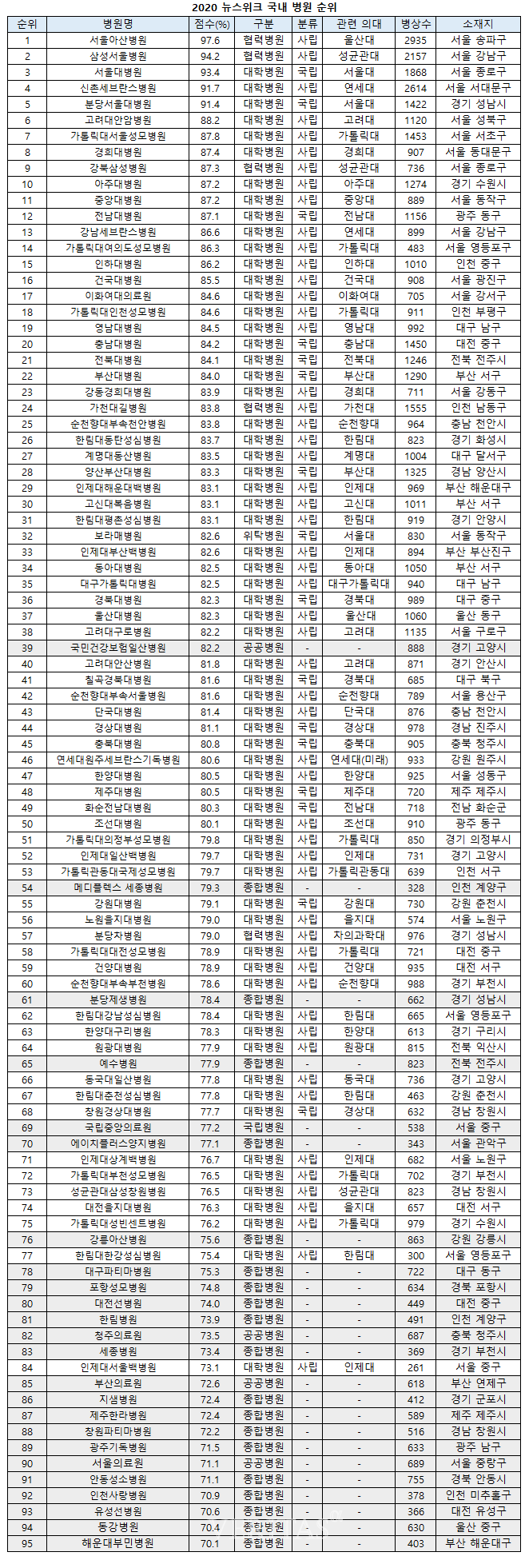 삼성서울병원 서울대병원 연대세브란스병원 분당서울대병원 톱5.. 2020뉴스위크 세계병원순위