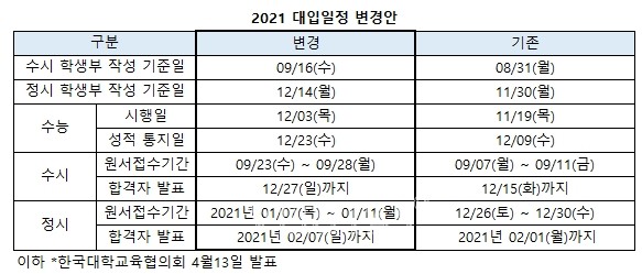 [베리타스알파=권수진 기자] 사상 초유의 12월 수능이 현실화된 가운데, 한국대학교육협의회가 수시/정시 원서접수 연기 일정을 13일 발표했다. 지난달 교육부는 2021수능을 2주 연기한 12월3일에 치른다고 밝히면서 수시 학생부 작성 마감일도 기존 8월31일에서 9월16일로 16일 연기했다. 다만 수시/정시 등 대입전형일정은 교육부의 제안일 뿐, 확정된 사안은 아니었다. 대교협이 대학과 협의를 거쳐 이번에 확정 발표했다.