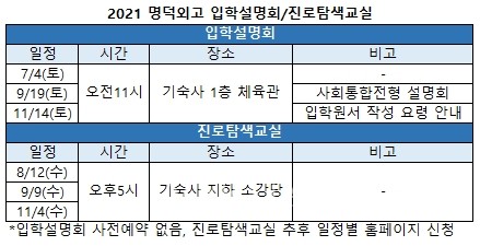명덕외고는 올해 입학설명회, 진로탐색교실 일정 공개와 함께 2021학년 신입생 입학설명회 자료도 게시했다. 설명회 자료에는 명덕외고 학교소개(진학결과), 수업내용 예시, 대입 구술/면접 대비를 위한 전공심화 내용, 해외교류 프로그램, 대입 전형에 따른 교육과정 최적화, 대입 성공 사례, 외고 선발전형 안내, 전년도 경쟁률/커트라인 등의 내용이 담겼다.