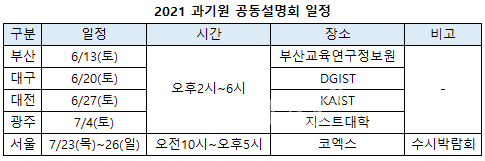 설명회는 6월13일 부산을 필두로 5개 대도시에서 열린다. 지역별 일정은 ▲부산 6월13일 부산교육연구정보원 ▲대구 6월20일 DGIST ▲대전 6월27일 KAIST ▲광주 7월4일 지스트대학순이다. 4개 광역시에 이어 서울은 대교협 수시박람회기간(7월23~26일)동안 코엑스에서 공동설명회를 실시한다. 모든 설명회는 오후2시부터 6시까지 네 시간동안 진행된다. 설명회와 함께 상담부스도 운영한다.