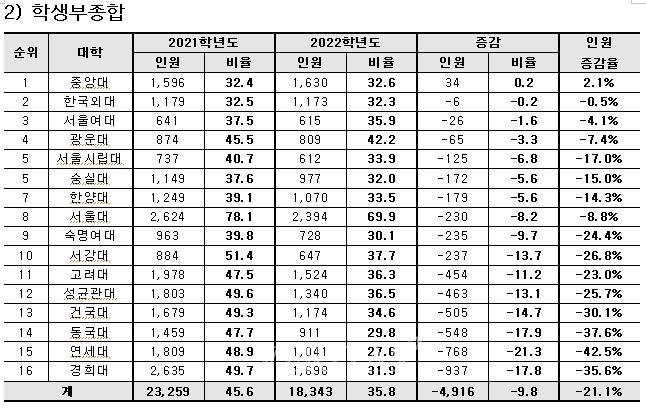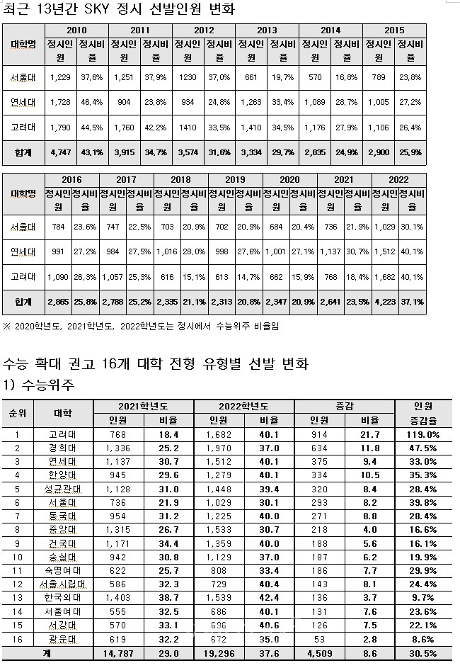 SKY의 정시(수능위주) 모집인원은 2022학년 4223명(37.1%)으로, 2011학년 이후 최대 수치다. 대학별로 보면 고대의 증가폭이 가장 크다. 2021학년 867명(18.4%)에서 2022학년 1682명(40.1%)으로 914명 늘었다. 연대는 2021학년 1137명(30.7%)에서 2022학년 1512명(40.1%)으로 375명 늘었다. 서울대는 2021학년 736명(21.9%)에서 2022학년 1029명(30.1%)으로 293명 늘었다.