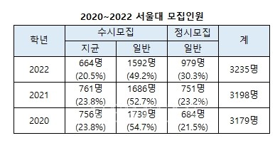[베리타스알파=권수진 기자] 2022학년 서울대 정시 비중이 30.3%로 확대된다. 정시확대의 여파로 수시 지균은 664명(20.5%), 일반은 1592명(49.2%)으로 줄어든다. 정부 주도로 정시확대가 강제되면서 2022학년 30%, 2023학년 40%까지 확대해야 하는 데 따른 변화다.