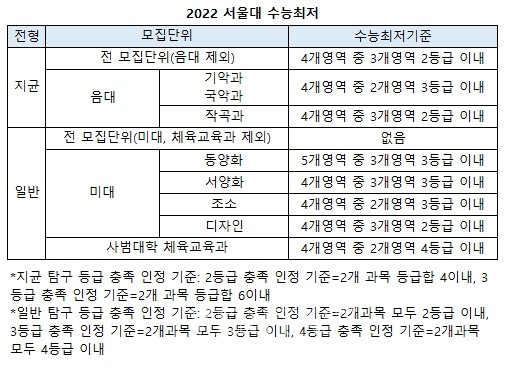 수능최저를 적용한다. 음대를 제외한 전 모집단위에서 국어 수학 영어 탐구 중 3개영역 이상 2등급이내다. 작곡은 3개영역 이상 2등급이내, 기악 국악은 2개영역 이상 3등급 이내다. 과탐은 서로 다른 분야의 2과목으로 Ⅰ+Ⅱ Ⅱ+Ⅱ조합만 인정한다. 탐구 등급 인정은 등급합을 기준으로 한다. 2등급을 충족하려면 2과목 등급합 4이내, 3등급을 충족하려면 2과목 등급합 6이내다.