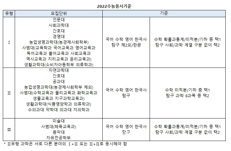유형Ⅰ에 해당하는 인문대학 사회과학대학 간호대학 경영대학 농업생명과학대학(농경제사회학부) 사범대학(교육학 국어교육 영어교육 독어교육 불어교육 사회교육 역사교육 지리교육 윤리교육) 생활과학대학(소비자아동학부 의류학과)은 국어 수학 영어 한국사 탐구 제2외/한문으로 응시해야 한다. 수학은 확률과통계 미적분 기하 중 택1, 탐구는 사회 과학 중 구분 없이 택2한다.
