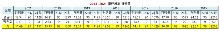 최근 7년간 대전과고의 경쟁률은 정원내 기준 2021학년 12.54대1(90명/1129명), 2020학년 14.21대1(90명/1279명), 2019학년 13.02대1(90명/1172명), 2018학년 13.53대1(90명/1218명), 2017학년 15.51대1(90명/1396명), 2016학년 17.7대1(90명/1593명), 2015학년 24.62대1(90명/2216명)의 추이다. 2014학년 과고에서 영재학교로 전환한 첫 해 모집에 20대1이 넘는 높은 경쟁률을 기록한 이후 그 다음해에도 경쟁률이 상승했다. 하지만 2015학년과 2016학년 세종영재와 인천영재가 각각 신설되면서 영재학교 문호가 넓어지고 영재성 검사일정을 통일하면서 과열된 지원양상이 안정된 모습이다. 2017년 이후 학력인구가 급격하게 줄어드는 상황에도 지난해에는 경쟁률이 상승하는 모습을 보이기도 했지만, 올해는 소폭 감소한 모습이다.