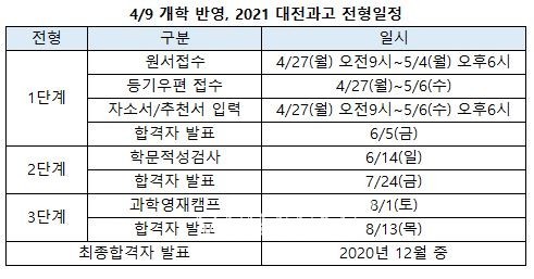대전과고 2021학년 입학전형 요강에 따르면 대전과고는 지난해와 마찬가지로 올해 신입생 정원내 90명, 정원외 9명 이내를 모집한다. 중3학년 재학생은 물론 졸업생과 중1,2학년 학생도 지원 가능하다. 중1,2학년 학생의 경우 상급학교 조기입학자격을 부여받아야 한다.