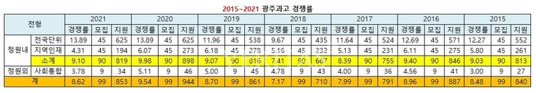최근 7년간 광주과고의 경쟁률은 등락을 반복했다. 2015학년 9.03대1(90명/813명)에서 2016학년 9.40대1(90명/846명)로 소폭 상승했다가 2017학년 8.39대1(90명/755명), 2018학년 7.41대1(90명/667명)로 2년간 하락했다. 그렇지만 2019학년 9.07대1(90명/816명) 2020학년 9.98대1(90명/898명)로 다시 2년 연속 상승세를 기록했다. 2021학년에는 9.1대1(90명/819명)으로 소폭 감소하긴 했지만 2017, 2018학년보다는 높은 경쟁률을 기록했다.