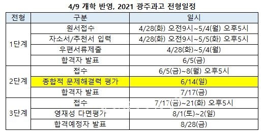 지난해에 이어 모집인원이 동일하다. 정원내 90명, 정원외 사회통합전형 9명 이내다. 광주과고는 정원내 모집인원 90명 중 절반인 45명을 지역인재전형으로 선발한다. 나머지 인원은 전국단위 선발이다. 지역인재선발은 원서접수 마감일 기준 광주 소재 학교(담양고서중 한재중 장성남중 남평중 포함)를 최근 1년 이상 다닌 졸업자/졸업예정자, 법령에 의해 중학교 졸업자와 동등 이상의 학력을 갖추고 있다고 인정되면서 광주에 최근 1년 이상 거주하고 있는 학생을 대상으로 한다. 정원내 전형과 정원외 전형은 중복 지원이 불가하다.