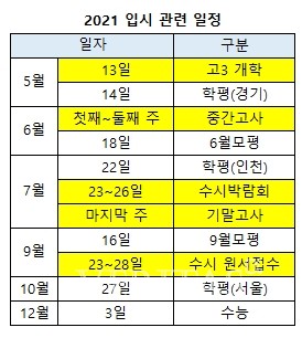 이후 모의고사도 사정은 다르지 않다. 기존 4월말~5월초 즈음 실시하는 중간고사는 고교에 따라 6월초중순으로 옮겨졌다. 같은 달 18일은 6월모평이 예정돼있다. 심지어 중간고사를 치른 바로 다음날 모평을 실시하는 고교도 있다. 모평준비와 내신준비를 동시에 해야 하는 셈이다. 임성호 종로학원하늘교육 대표는 "중요 시험이 단기간에 집중적으로 몰려 있어 수능/모의고사에 대한 객관적 평가가 가능할지에 대한 불안감이 있다"며 "수능점수에 대한 예측 어려움으로 수시/정시 지원 선택에서 불안이 있을 수도 있다"고 말했다.