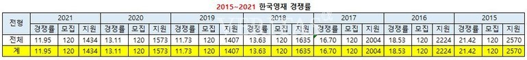 한국영재의 최근 7년간 경쟁률은 2021학년 11.95대1(모집120명/지원[]명), 2020학년 13.11대1(모집120명/지원1573명), 2019학년 11.73대1(120명/1407명), 2018학년 13.63대1(120명/1635명), 2017학년 16.7대1(120명/2004명), 2016학년 18.53대1(120명/2224명), 2015학년 21.42대1(120명/2570명)의 추이다. 20대1을 넘나드는 높은 경쟁률을 기록하다 학령인구가 대폭 하락한 2017학년부터 경쟁률이 다소 주춤한 모습으로, . 2015학년 세종영재, 2016학년 인천영재가 문을 열어 전국 영재학교가 8개 체제로 확대되면서 전체 지원자풀이 분산된 영향도 있다. 2009년 KAIST부설로 졸업생의 상당수가 KAIST에 진학하는 교풍도 지원양상에 영향을 미친 것으로 분석된다.