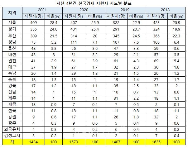 올해 지원에도 서울출신이 가장 많았다. 지역별 지원은 서울 28.4%(409명), 경기 24.8%(355명), 부산 21.5%(309명) 순이었다. 지난해에도 서울 경기 부산 순으로 각 25.9%(407명), 25.4%(401명), 20%(314명) 순으로 비율이 높았다. 상위 3개지역 다음으로는 경남 5.2%(75명) 울산 3.3%(48명) 대전 3%(43명) 인천 2.9%(41명) 대구 1.9%(27명) 충남 1.4%(20명) 충북 1.3%(18명) 경북 1.2%(17명) 전남 1%(14명) 제주 1%(14명) 세종 0.9%(13명) 전북 0.8%(11명) 강원 0.6%(9명) 광주 0.3%(4명) 순이다. 외국유학생 4명과 검정고시 3명이 포함됐다. 성별로는 남학생 79.8%(1144명), 여학생 20.2%(290명)이었다.