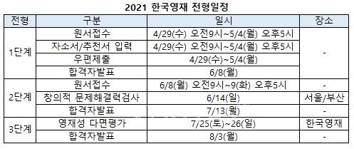 올해도 지난해와 동일하게 3단계 전형을 통해 선발이 진행된다. 2019학년까지는 2단계 전형으로만 20명 이내의 우수자가 선발됐었지만 지난해부터 단계별로 우수자를 20명 이내로 선발할 수 있도록 변경됐다. 각 단계의 우수자로 선발된 학생도 다음 단계 전형에는 반드시 참여해야 한다. 불참할 경우 불합격 처리가 된다. 한국영재 입시는 수학과학 분야의 영재성과 잠재성을 판별하기 위해 학생기록물평가, 창의적 문제해결력평가, 영재성 다면평가를 거치는 입학담당관 중심 과학영재전형이다.