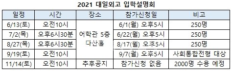 코로나19 감염에 대한 우려로 올해 입학설명회는 예년보다 한 달가량 늦은 6월부터 시작된다. 설명회 일정은 6월13일 7월2일 8월27일 9월19일 11월14일 순이다. 6월과 9월 설명회는 오전10시, 7월과 8월 설명회는 오후6시30분부터 실시할 예정이다. 9월 설명회의 경우 사회통합전형 대상자를 위해 진행된다. 6월부터 9월까지 네 차례의 설명회는 모두 대일외고 어학관 5층 다산홀에서 열린다. 11월 최종설명회 장소는 아직 확정되지 않았다.