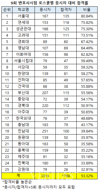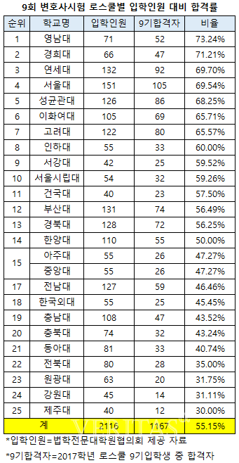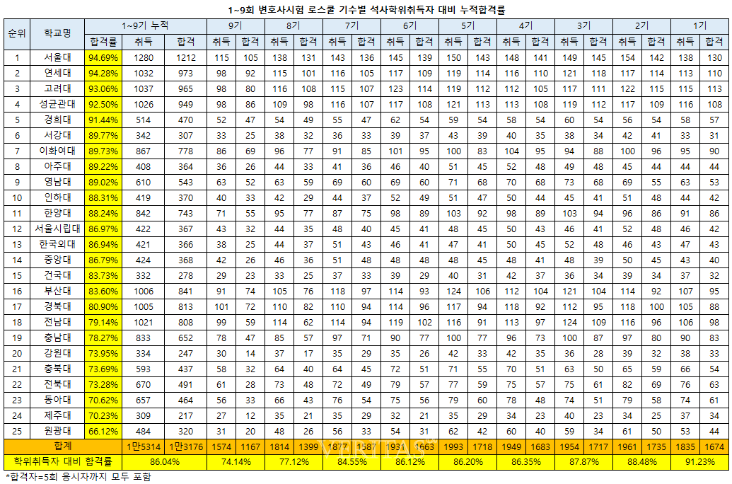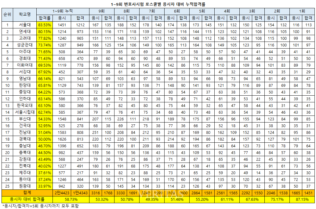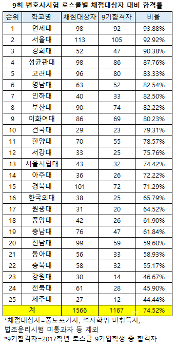 ‘채점대상자 기준’ 9기입학생 합격률.. 연대 서울대 경희대 성대 고대 순