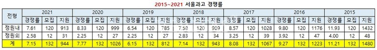 서울과고의 최근 6년간 경쟁률은 정원내 기준 2021학년 7.61대1(모집120명/지원913명), 2020학년 8.33대1(모집132명/지원999명) 2019학년 6.54대1(120명/785명), 2018학년 7.58대1(120명/909명), 2017학년 8.57대1(120명/1028명), 2016학년 9.8대1(120명/1176명), 2015학년 11.93대1(120명/1432명)의 추이다. 2015학년 세종영재, 2016학년 인천영재가 차례로 신설된 영향으로 영재학교 모집인원이 200여 명 증가했던 시기부터 경쟁률이 하락하는 추세였다. 4년 전인 2017학년 학령인구가 7만명 가량 줄어든 데 이어 2018학년에도 6만명, 올해 3만여 명이 줄어들었지만 2019학년보다 높은 경쟁률을 기록했다는 점에서 여전한 인기를 입증한 것으로 보인다.