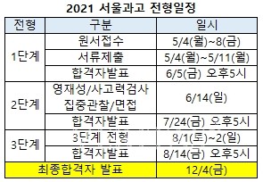 서울과고 올해 모집인원은 정원내 120명, 정원외 12명 이내로 지난해와 동일하다. 중학교 재학생과 졸업생, 이에 상응하는 자격을 갖춘 자 가운데 수학 과학 분야에 뛰어난 재능과 잠재력을 가진 학생이라면 전국 어디에서나 지원할 수 있다. 전형은 3단계로 진행된다. 1단계 학생기록물 평가, 2단계 영재성/사고력 창의성/문제해결력 검사, 3단계 과학영재캠프의 과정이다.