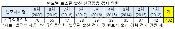 2012년 1회 변호사시험 합격자를 최초로 임용한 당시 42명의 로스쿨 출신을 검사로 임용했다. 2회(2013년) 37명, 3회(2014년) 35명, 4회(2015년) 39명, 5회(2016년) 39명, 6회(2017년) 38명, 7회(2018년) 55명, 9회(2020년) 70명의 추이다. 이번 최대 인원 선발은 사법시험 출신의 사법연수원 수료자가 대폭 줄었기 때문으로 보인다. 1950년 시작된 사법시험는 2016년 58회 1차시험, 2017년 59회 2차시험까지 실시됐고 사법연수원 마지막 기수는 49기까지다. 사법연수원 49기는 2018년부터 사법연수원에 입소해 올해 1월 수료했다. 올해 사법연수원을 수료한 인원은 47기 5명, 48기 2명, 49기 61명 총68명이다. 전년인 48기 수료식에는 46기 1명, 47기 4명, 48기 112명 총117명으로 전년과 비교해 49명이 줄은 수치다. 49기 취업대상인원 중 검사로 진로가 정해진 인원은 17명, 48기는 20명이었다.