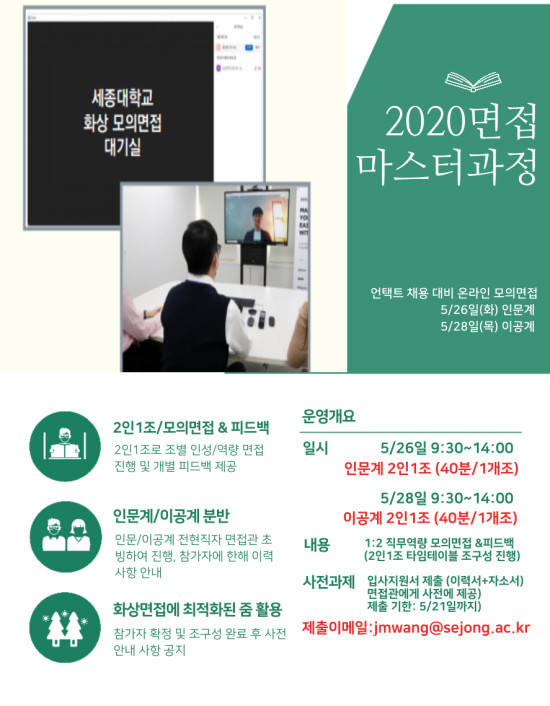 [베리타스알파=나동욱 기자] 세종대는 대학일자리사업단이 15일까지 ‘2020 면접마스터과정’ 참여자를 모집한다고 14일 밝혔다.