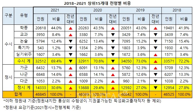 [베리타스알파=권수진 기자] 2021수시에서 상위15개대(건국대 경희대 고려대 동국대 서강대 서울대 서울시립대 성균관대 숙명여대 연세대 이화여대 인하대 중앙대 한국외대 한양대)의 수시비중이 소폭 감소한다. 2020학년 3만2911명(70.6%)에서 2021학년 3만2512명(69.4%)으로 줄었다. 2019학년까지 이어져오던 확대세가 2020학년부터 축소세로 돌아선 이후 이어가는 모습이다. 2022대입개편 결과 정시30% 이상을 대학에 요구한 상황에서 예견됐던 결과다.