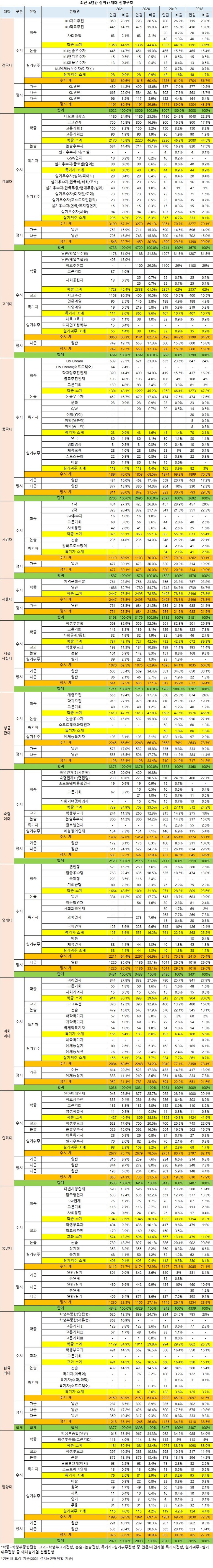 각 대학이 18일까지 공개한 2021학년 수시요강을 분석한 결과 학종은 44%로 여전히 단일전형 최대 비중을 유지한다. 논술이 12.4%로 뒤를 잇는다. 교과8.4% 실기위주3.4% 특기자1.2% 순이다. 수시 축소는 논술/특기자에서 두드러진다. 학종이 2020학년 43.5%에서 2021학년 44%로, 교과가 2020학년 7.3%에서 2021학년 8.4%로 확대된 반면, 논술은 2020학년 13.4%에서 2021학년 12.4%로, 특기자는 2020학년 2.9%에서 2021학년 1.2%로, 실기위주는 2020학년 3.6%에서 2021학년 3.4%로 줄었다.