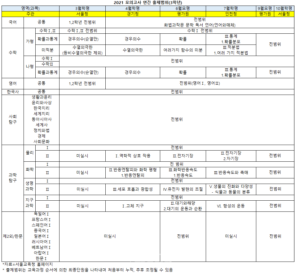 절대평가로 실시되며 전 수험생이 반드시 응시해야 하는 한국사를 비롯해 국어 영어 사회탐구 과학탐구Ⅰ는 전범위 출제가 이뤄지는 영역이다. 3월학평에서 국어와 영어는 1~2학년 교육과정이 출제범위였지만 4월학평부터 전범위로 확대된다. 여타 영역들의 경우 전범위 출제가 이뤄지지 않는 데다 출제대상에서 제외된 영역도 존재한다. 제2외국어/한문은 6월모평 이전까지 전국단위 모의고사의 출제대상에서 완전 배제된다.